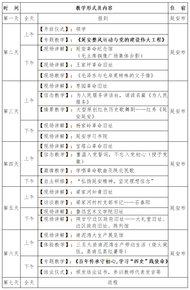 本次研修依托陕西省延安市的红色文化资源优势,力求“研修内容丰富化、教学形式多样化、实践路线特色化、团队服务专业化”,采用专题教学、现场讲解、现场教学、信念教学、情景教学、激情教学、访谈教学、体验教学等多位一体的教学模式进行研修。