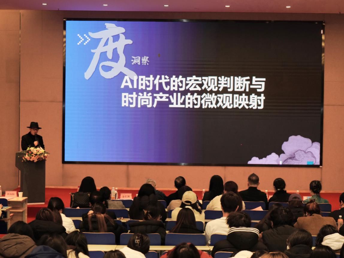 上海国际时尚教育中心数字时尚学院院长、产业数字化特聘顾问金宏渊则以《智绘时尚 设计新生——AI时尚学习工作新范式》为主题,聚焦AI技术在时尚领域的应用场景,从势、术、人等角度,深度分析当前数据时代对当下时尚设计的影响,分享了数字技术为服装服饰设计、人才培养带来的全新变革,展现了数智时代时尚产业的无限可能,他强调以人为本的AI共生时尚。