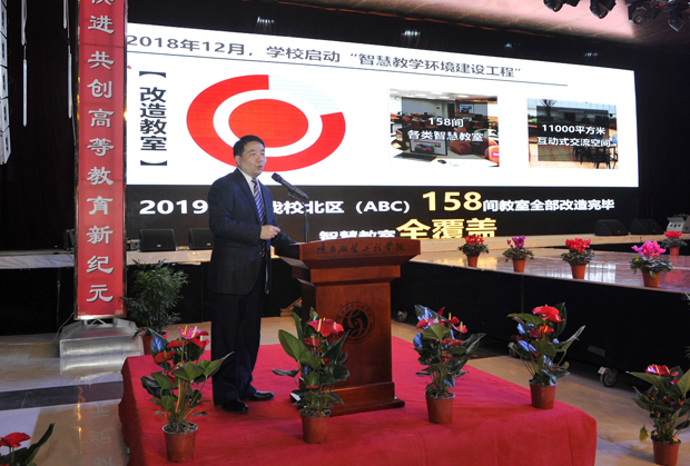 吴俊林重点介绍了学校近期实施校园环境提升改造和教育教学设施、实训实验中心等改善建设主要情况和学校提升教育教学质量采取的各项措施。当看到吴俊林在PPT汇聚的学校硬件建设设计图景展示时,全场师生激动感慨,脸上洋溢着期盼的神情。